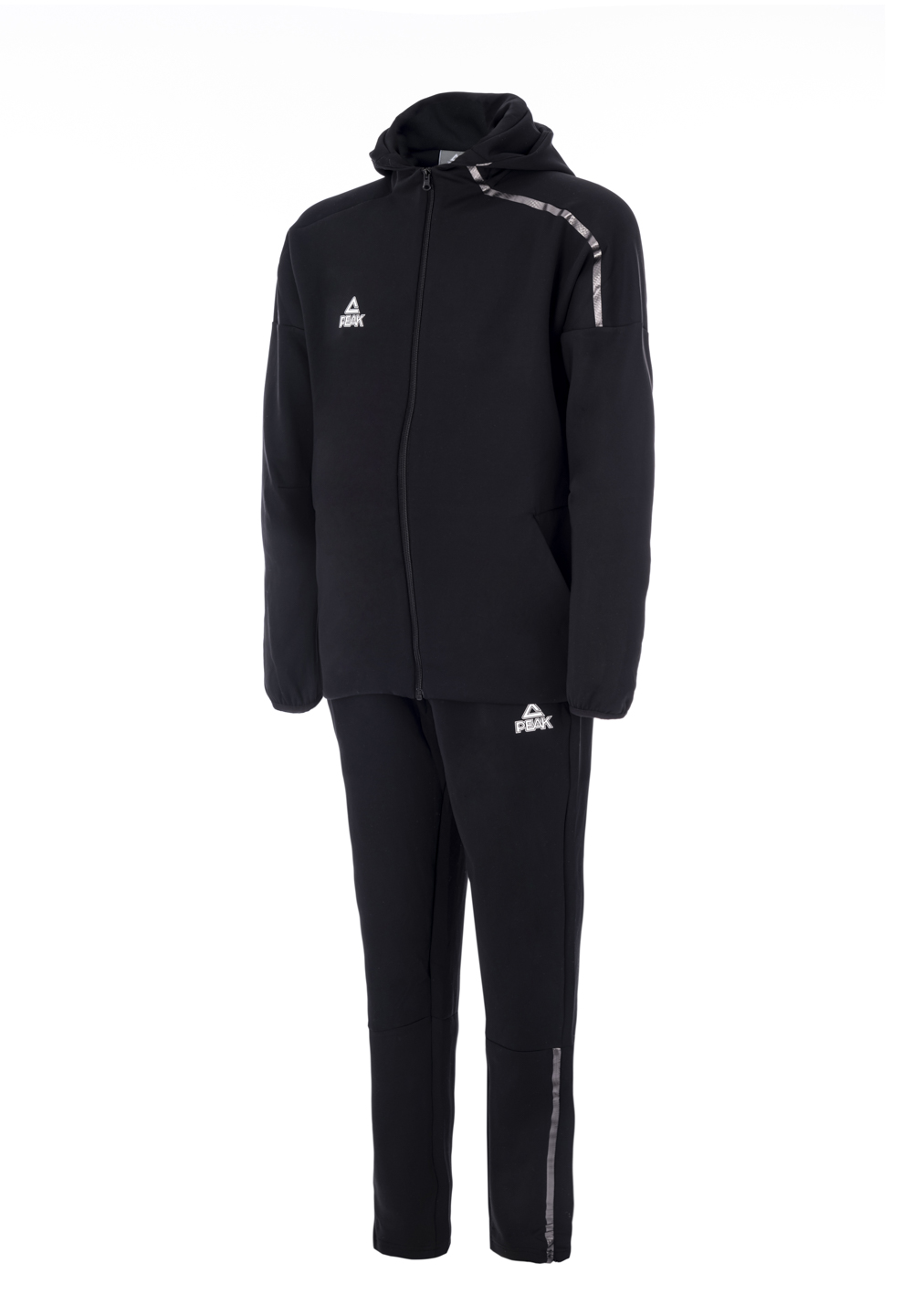 Das Herren Model hat seitlich an der Taille tiefe, praktische Reißverschlusstaschen, die „Mann“ erlaubt, alles mitzunehmen, was er im täglichen Training braucht. An der linken Schulter verläuft ein schwarzer, leicht refkletierender Streifen, der den Anzug noch stylischer aussehen lässt. Auf der rechten Brust befindet sich, in weißer Stickerei, unser PEAK Logo. Die Jacke lässt sich recht weit nach oben schließen, so dass man bei Wind und Wetter gut geschützt ist und kein Zug entsteht.