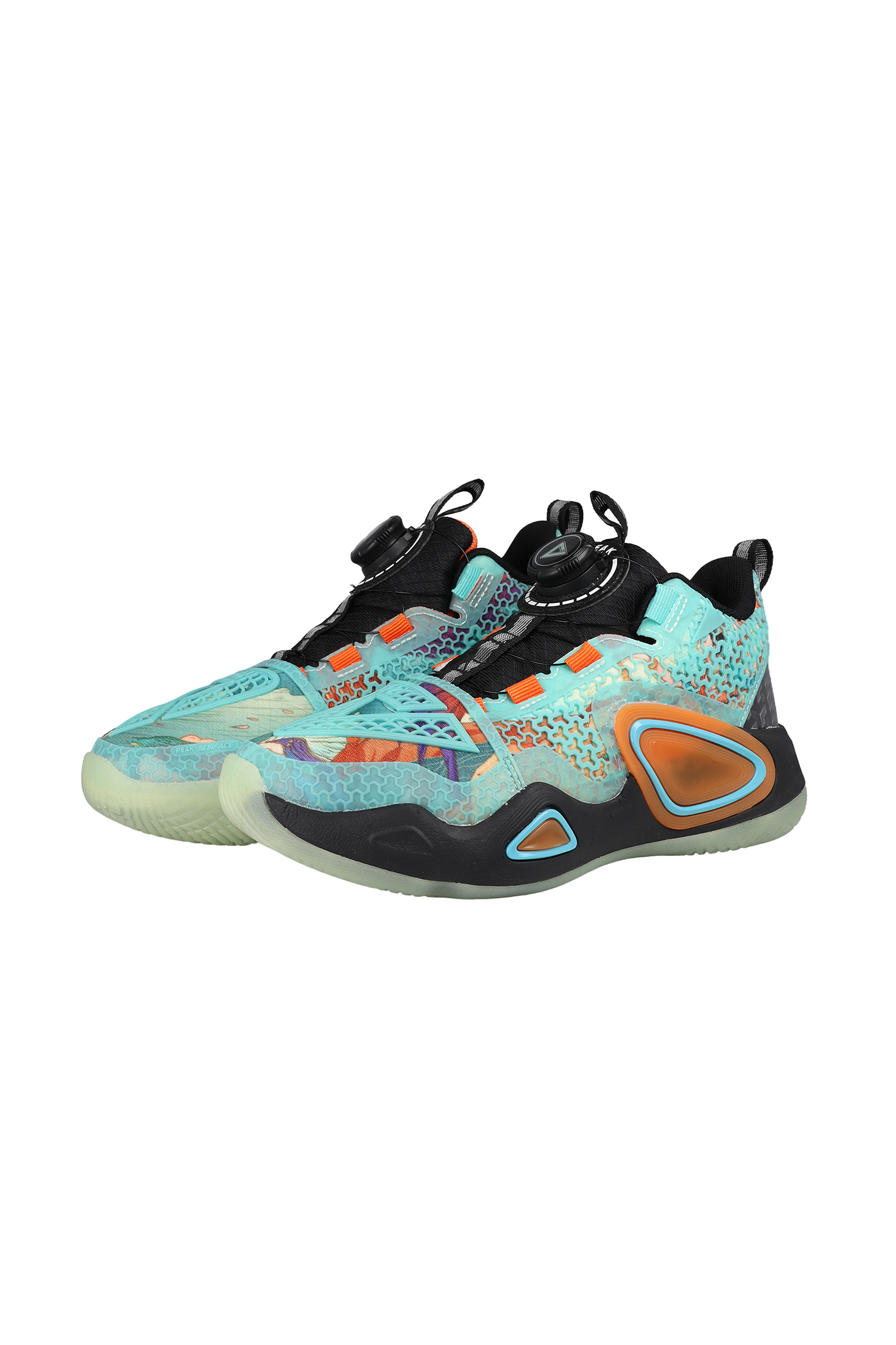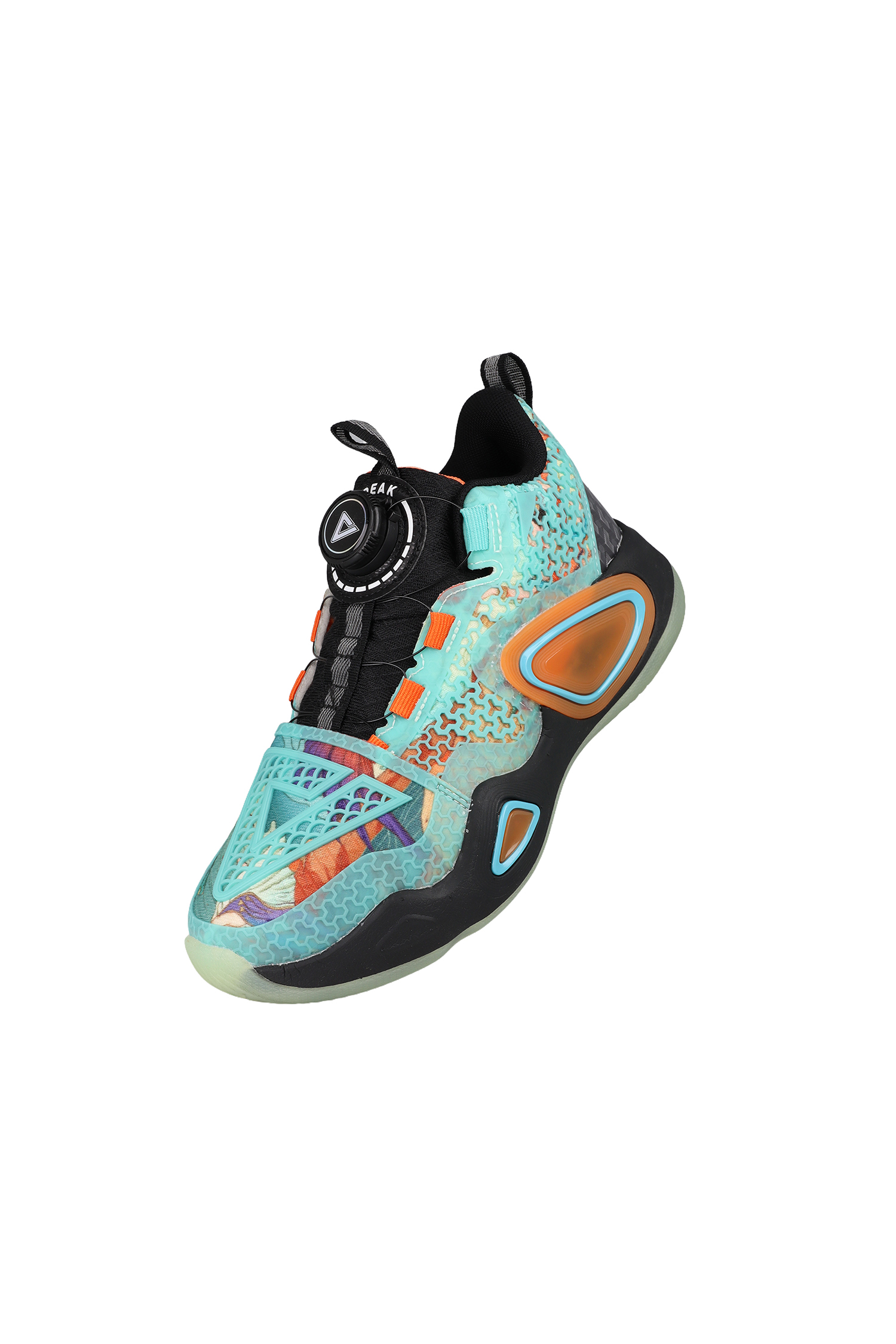 Der auffällig designte Peak Basketballschuh kombiniert moderne Performance‑Technologie mit einem dynamischen, multicolor Look. Das Obermaterial besteht aus strapazierfähigen synthetischen Mesh‑Elementen und transparenten Overlays, die für Stabilität und Atmungsaktivität sorgen. Die innovative Verschlusslösung mit Drehverschluss ermöglicht einen festen, individuell anpassbaren Sitz. Die voluminöse, seitlich verstärkte Mittelsohle bietet optimale Dämpfung und Halt bei schnellen Richtungswechseln. Eine durchscheinende Außensohle sorgt für Grip auf Indoor‑ und Outdoor‑Courts.