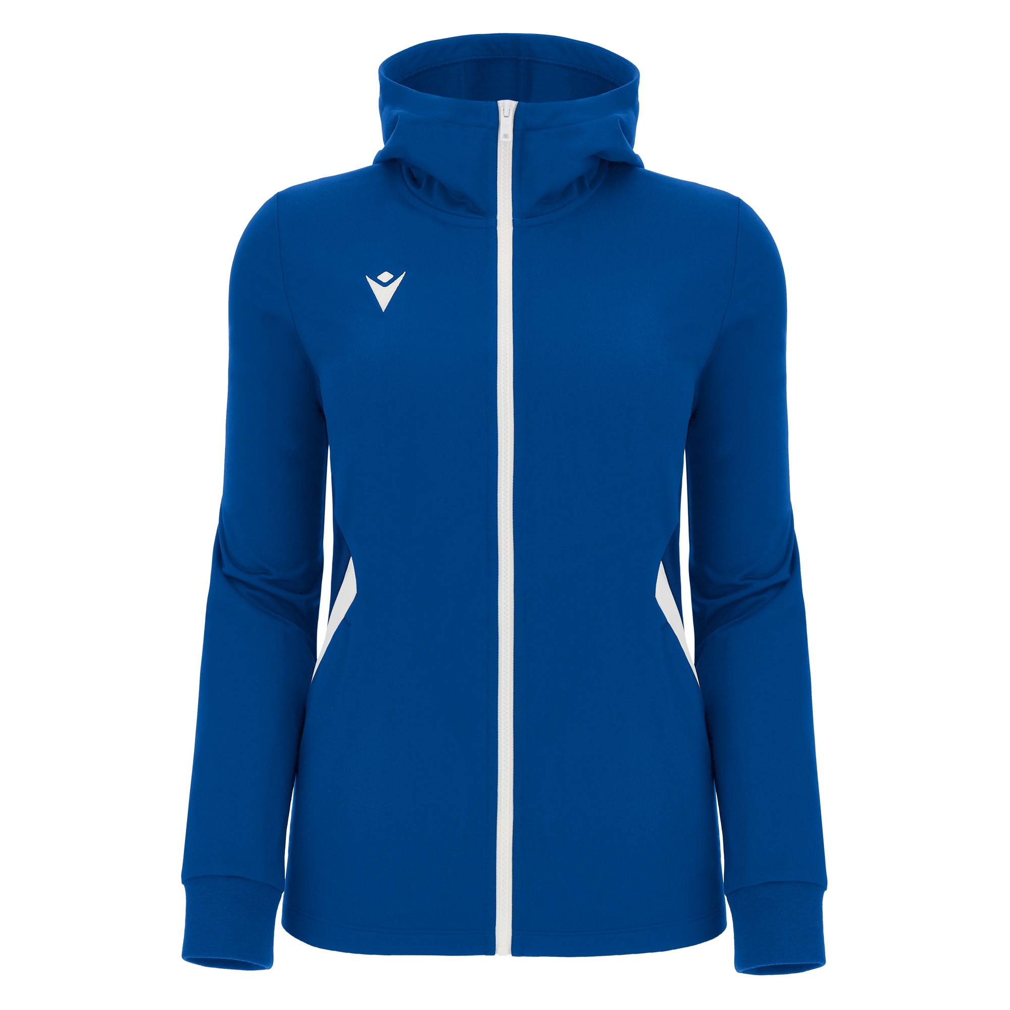 Damen-Präsentations-Oberteil mit Kapuze aus Polydry-Gewebe. Der durchgehende Spritzguss-Reißverschluss in der Mitte wird durch einen gummierten Zug mit Macron Hero geöffnet. Geräumige Seitentaschen mit umgekehrtem Reißverschluss aus Nylon. Die Ärmelbündchen sind aus Strick gefertigt.
